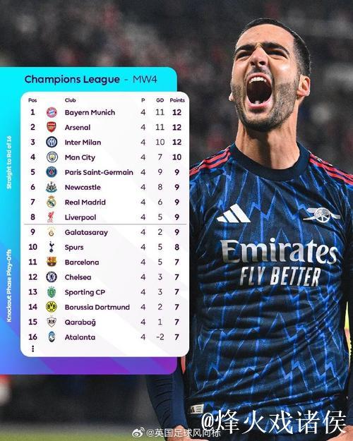 随着本轮欧冠小组赛战罢,各大豪门的最新积分形势逐渐清晰,竞争格局也愈发白热化。在多场焦点对决中,状态火热的阿森纳延续出色表现,再度取胜后实现小组赛全胜,以完美战绩高居积分榜首,成为本赛季欧冠迄今为止最